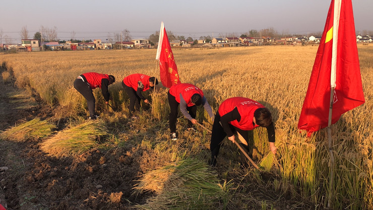 身穿红马甲的党团员干部到水稻田间后,分为三个小组,一组撸起袖子,卷起裤脚,挥舞着镰刀,娴熟地收割水稻;二组负责捆绑收割好的水稻;三组负责装车、运输,大家分工明确、相互配合、挥汗如雨,金色的水稻田里洋溢着丰收的喜悦。不一会儿就收割了一大片,老人看在眼里喜在心里。